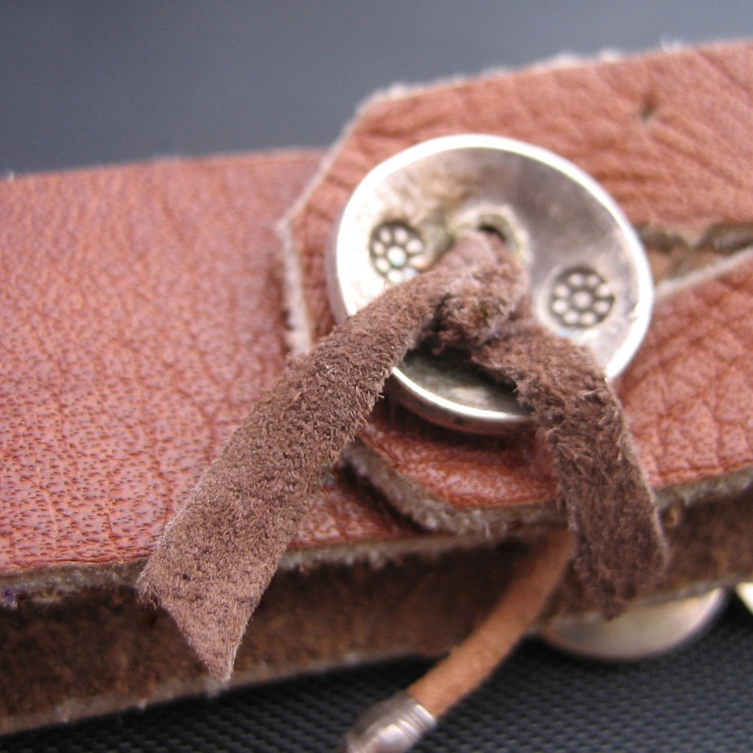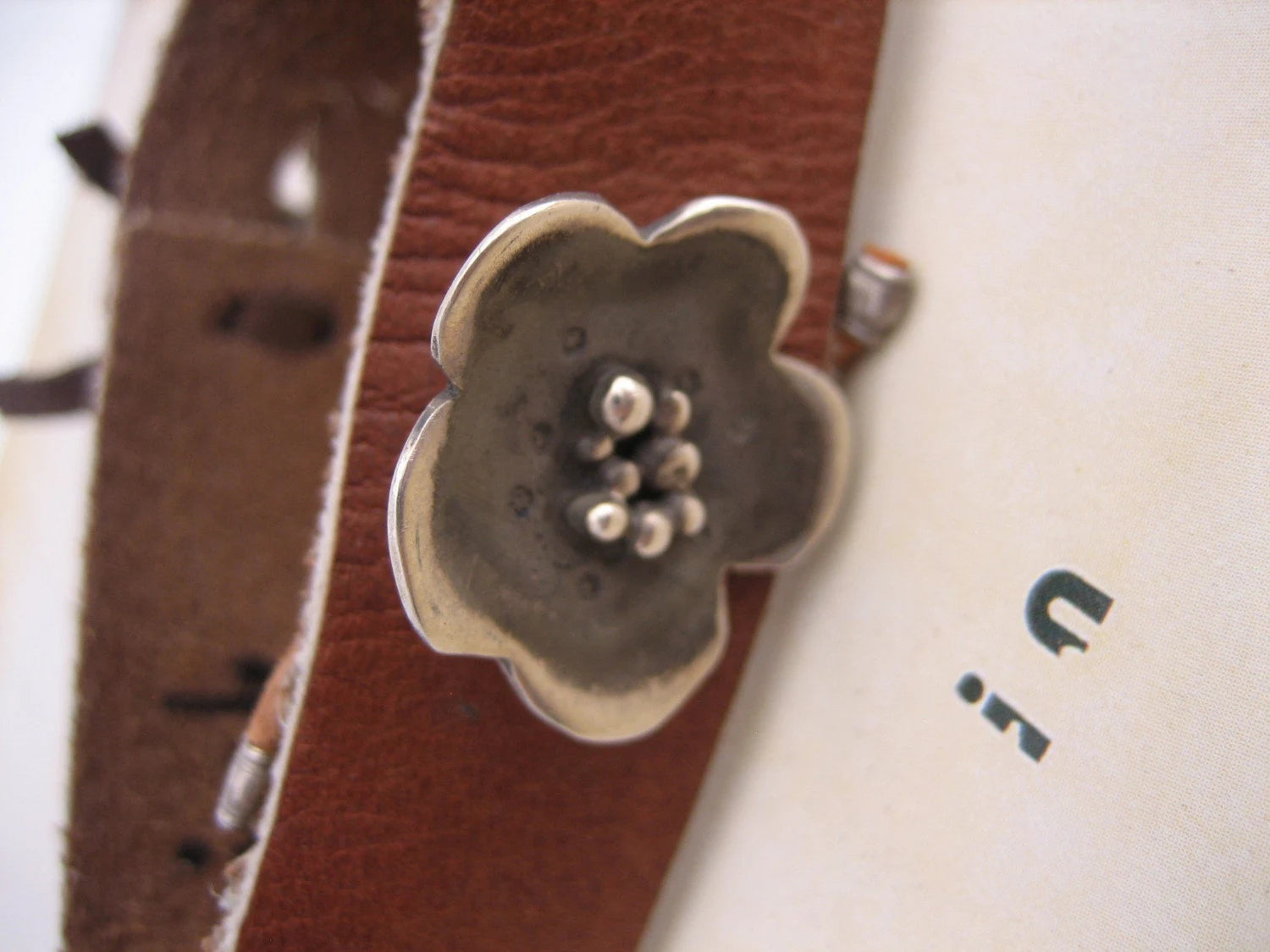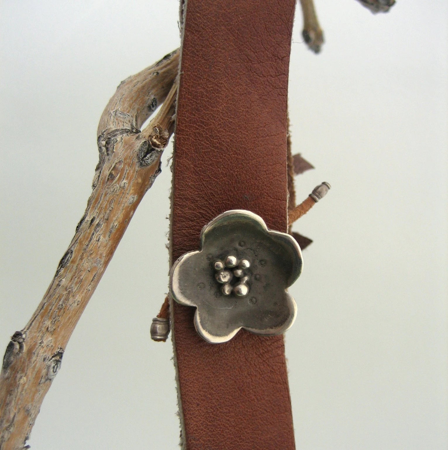 Earth brown leather wrap hosts our lone flower (hand made from sheet silver by us!). Closes with a single hand made sterling button. These bracelets soften and patina beautifully so go ahead wear yours every day!