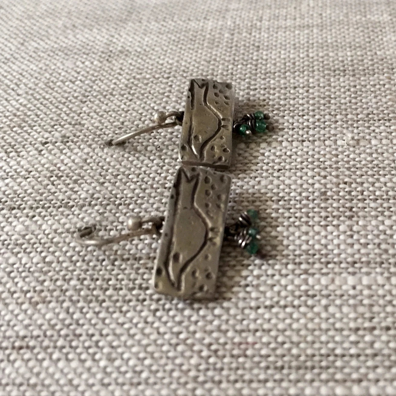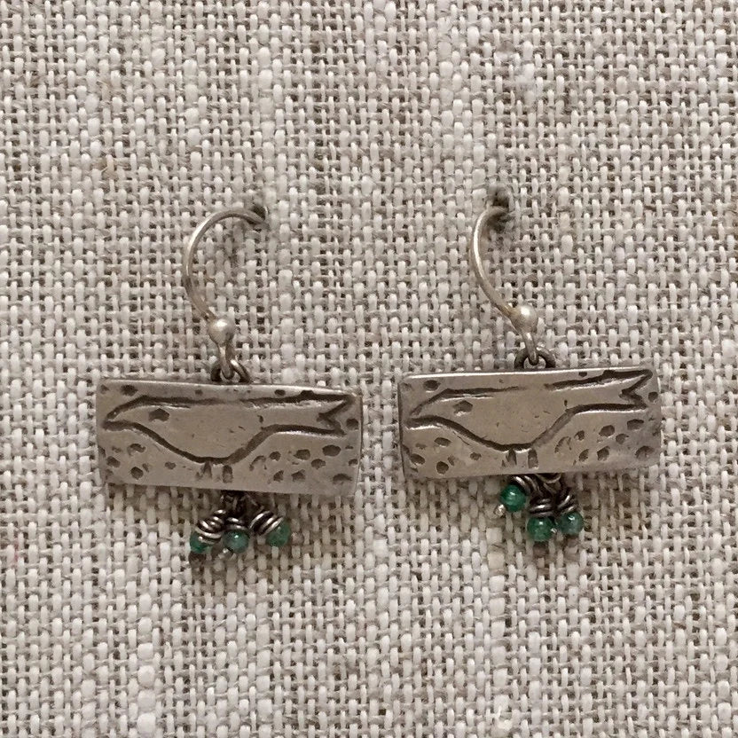 Solid Sterling Rectangles have tiny birds we call Poindexter marching across. With a trio of tiny sea green apatite gemstone balls dangle below.