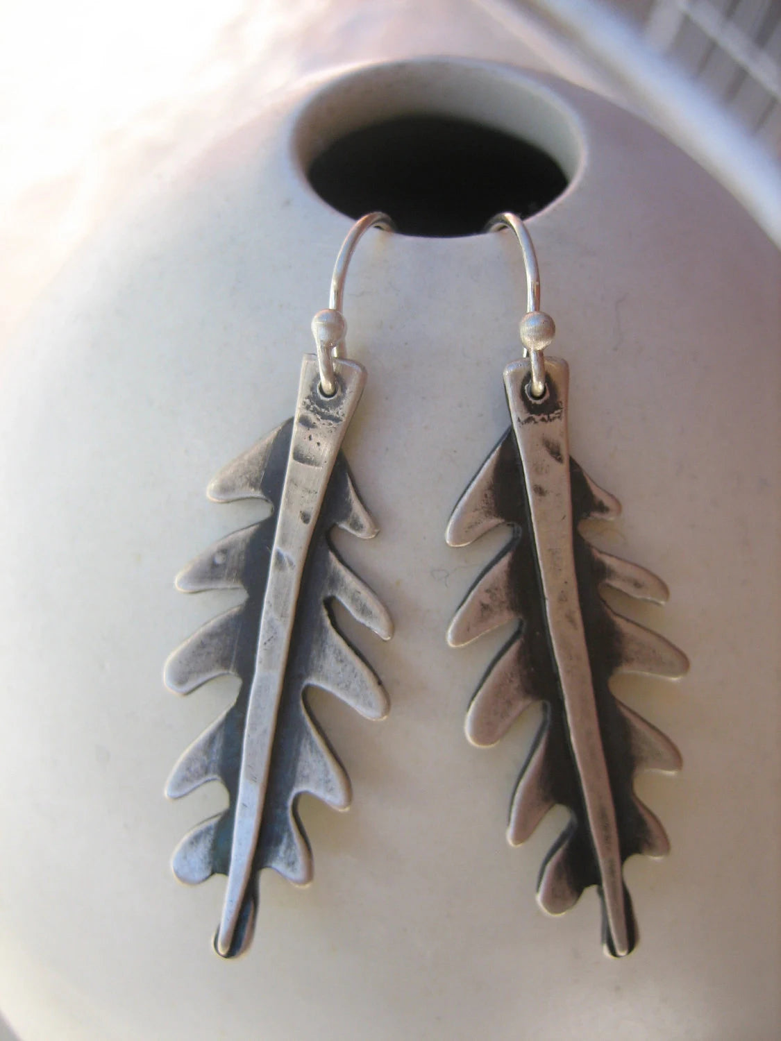 There is a fern in the corner of my yard that holds court over this shady quiet enclave. All kinds of flora and fauna frequent this rich and shady habitat. These sterling silver fronds were inspired by this magical world. Softly rounded and organic these lovely leaves sway gently and dangle about 1 &1/2 inches from sterling silver french wires. Lets these earrings wisper cool secrets to you. I know they speak to me.