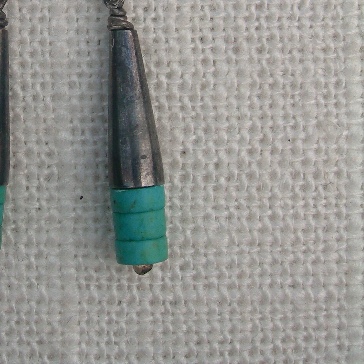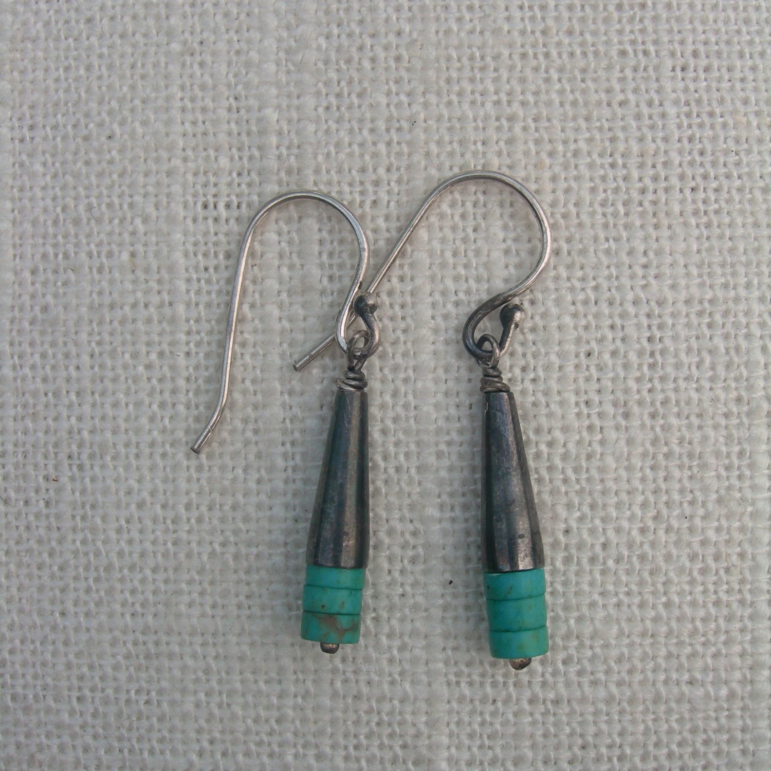 Oxidized sterling cones hold three turquoise heishi which appear to peek out from below. Inspired by vintage Native American jewelry. Simple and elegant, the perfect compliment to your favorite pair of jeans.