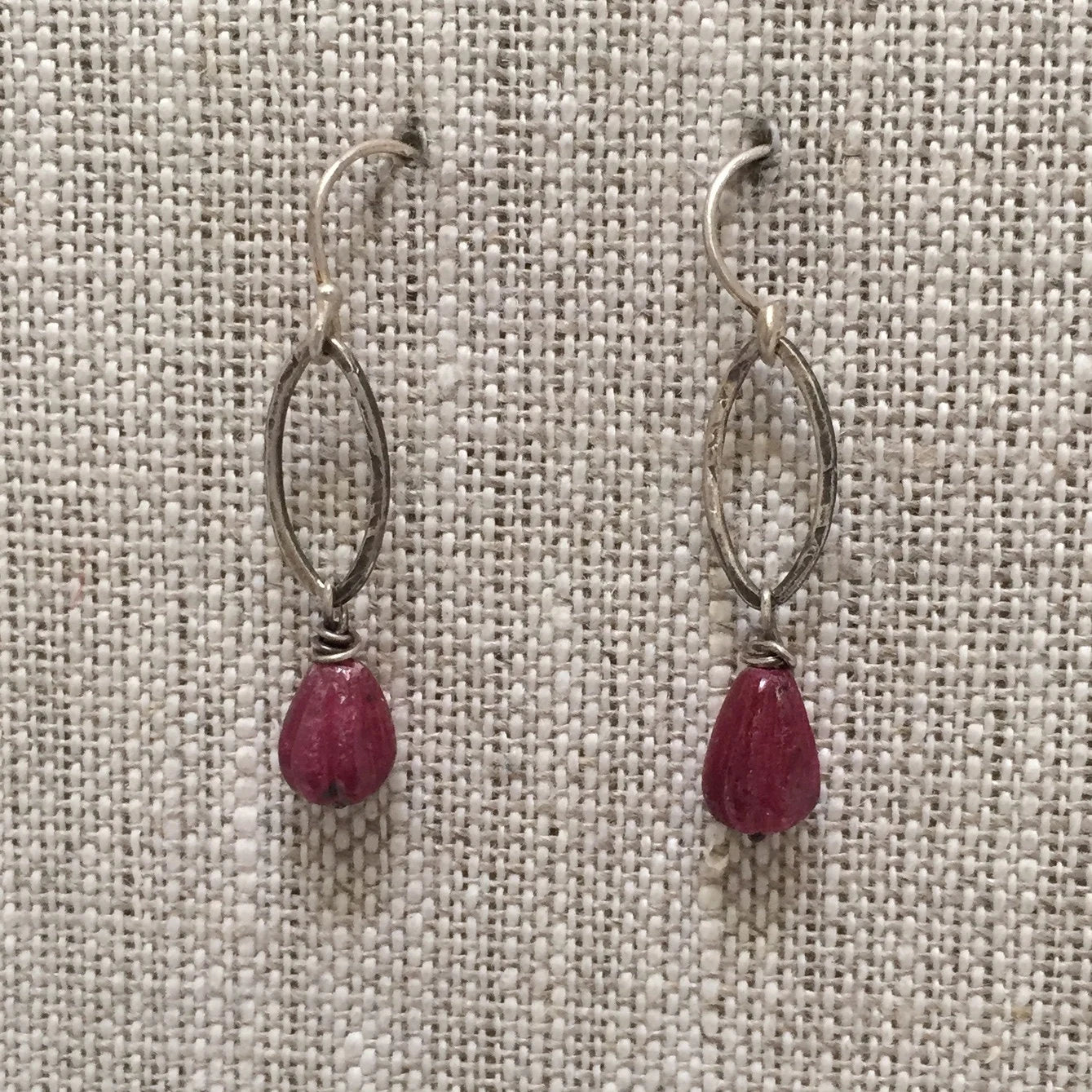 Nothing to cry about when you wear these darling earrings! Raspberry hued and delicately carved tear drop shaped rubys dangle from sweet sterling silver textured hoops. Slightly oxidized and hanging from a sterling silver ear wire. Length approximately 3/4 inches