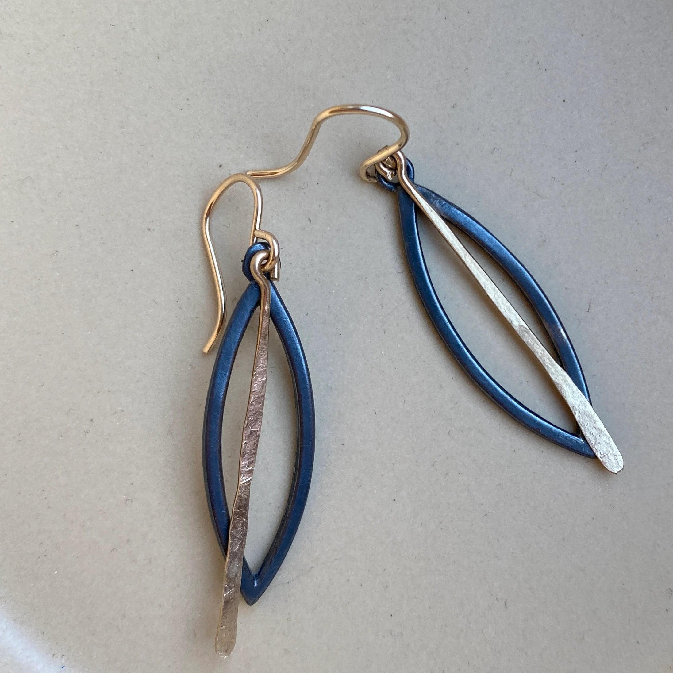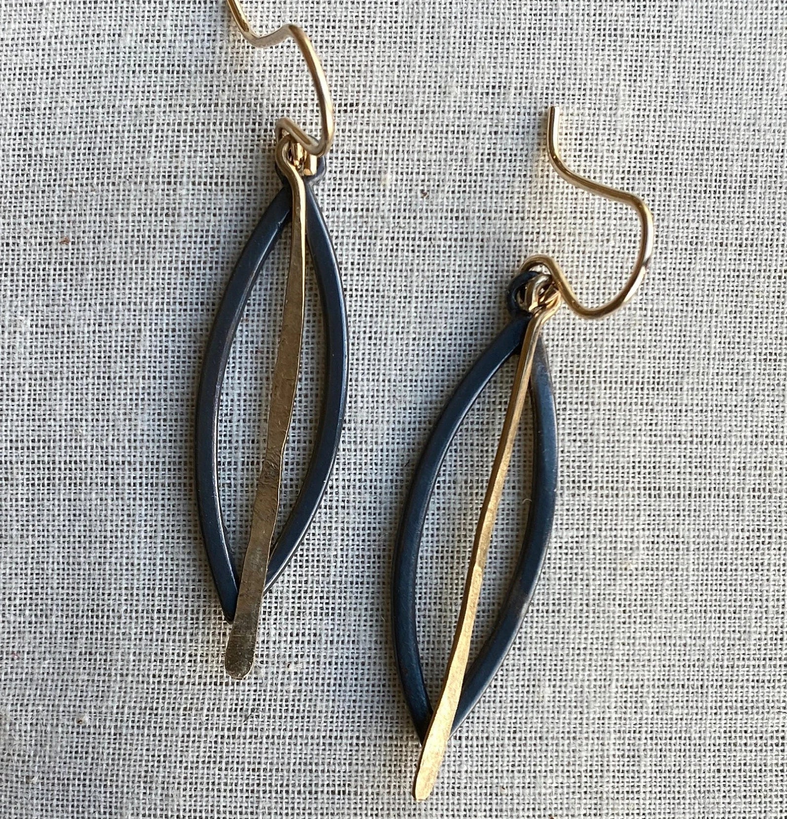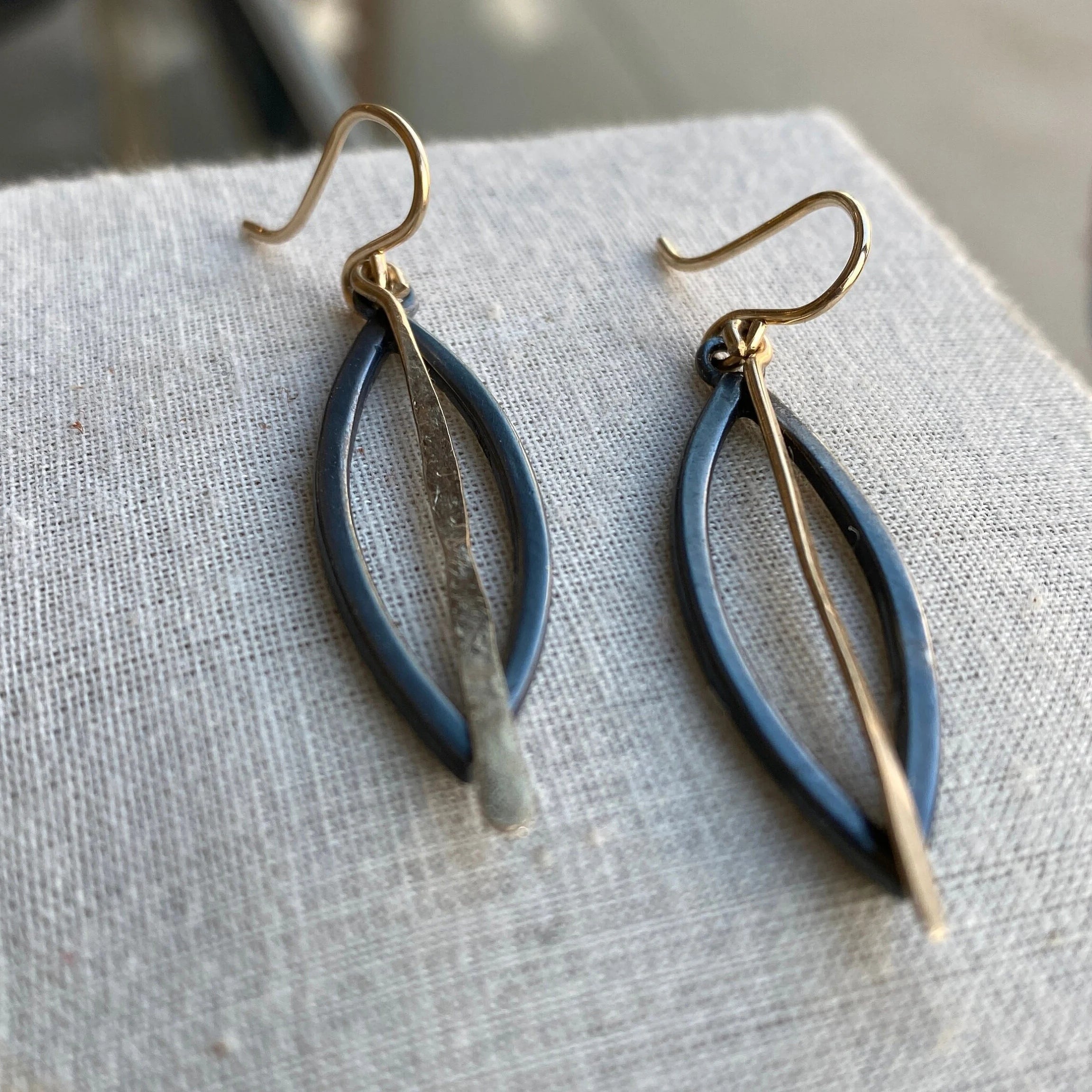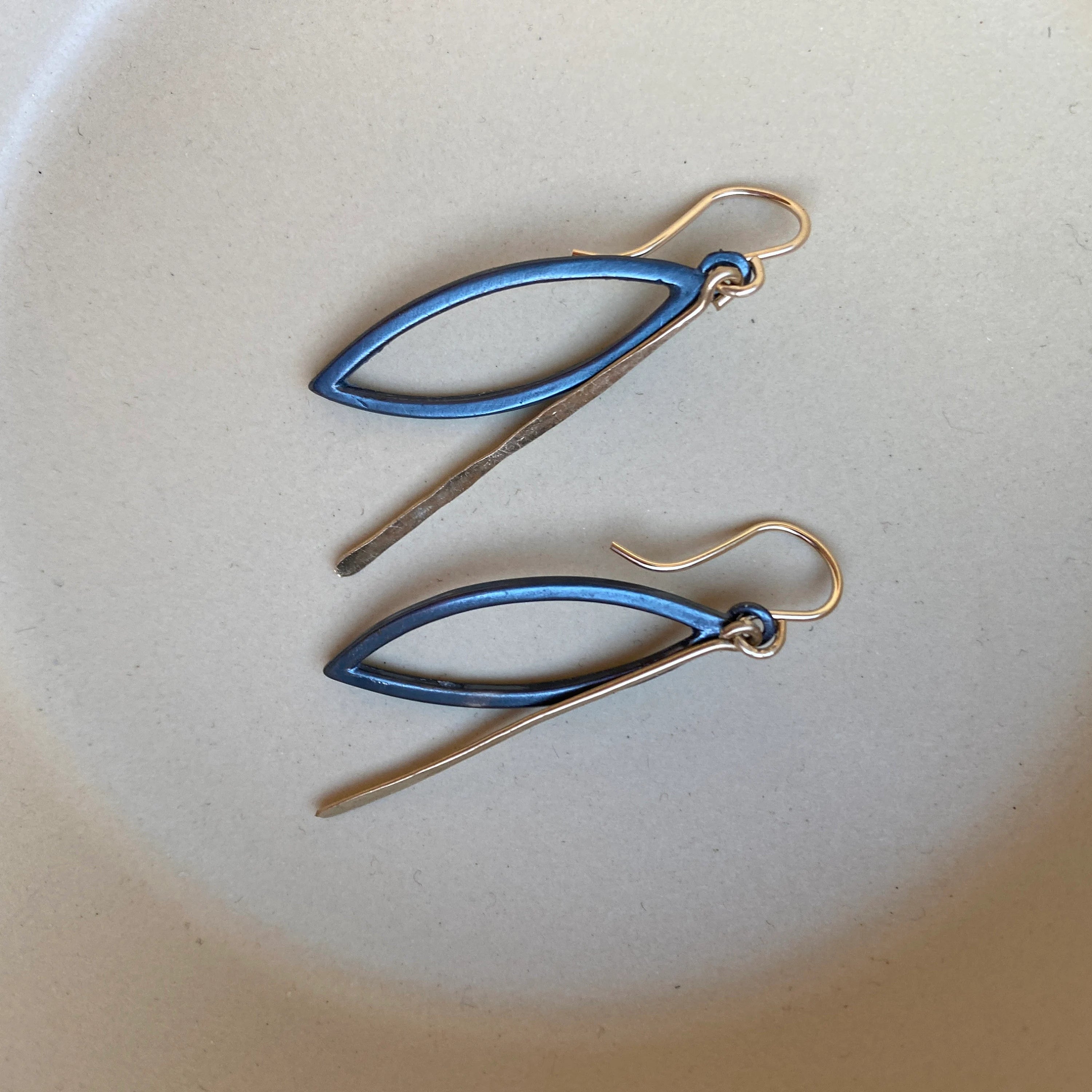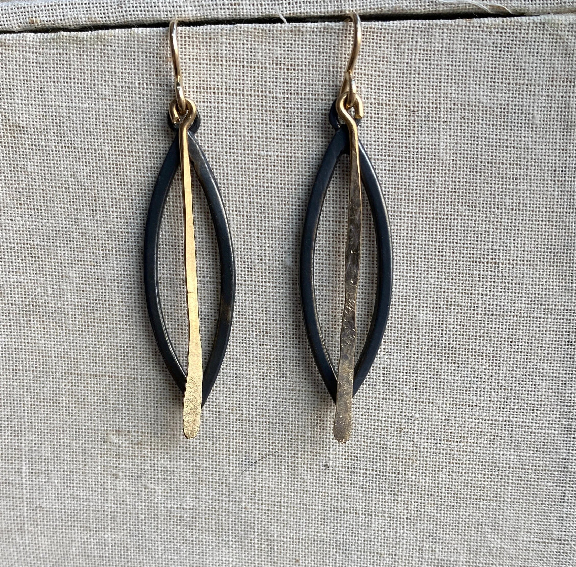 Introducing the enchanting "Third Eye" earrings in blackened sterling silver and gold fill! These earrings feature a unique eye-shaped design that will surely catch everyone's attention. The combination of blackened sterling silver and gold fill creates a stunning contrast, adding a touch of elegance to any outfit.