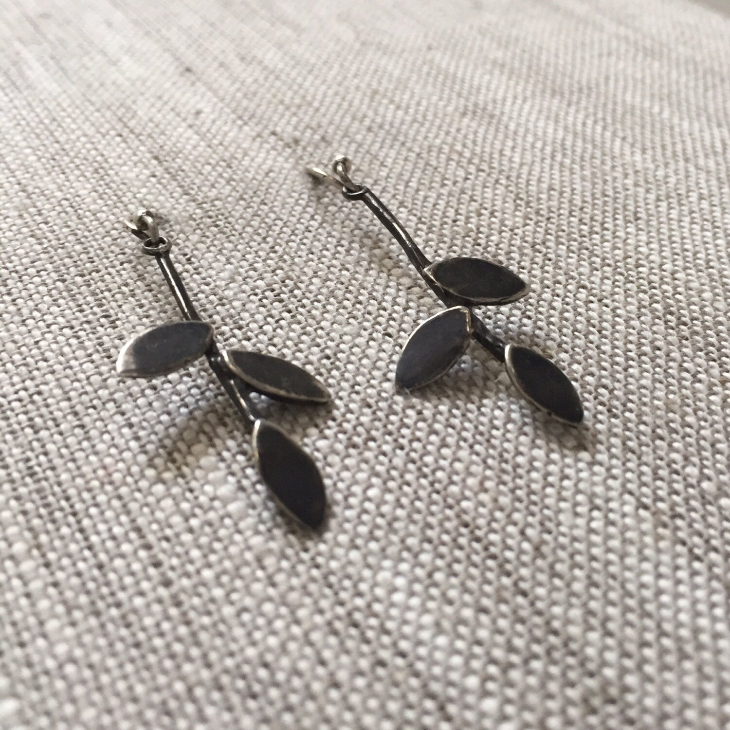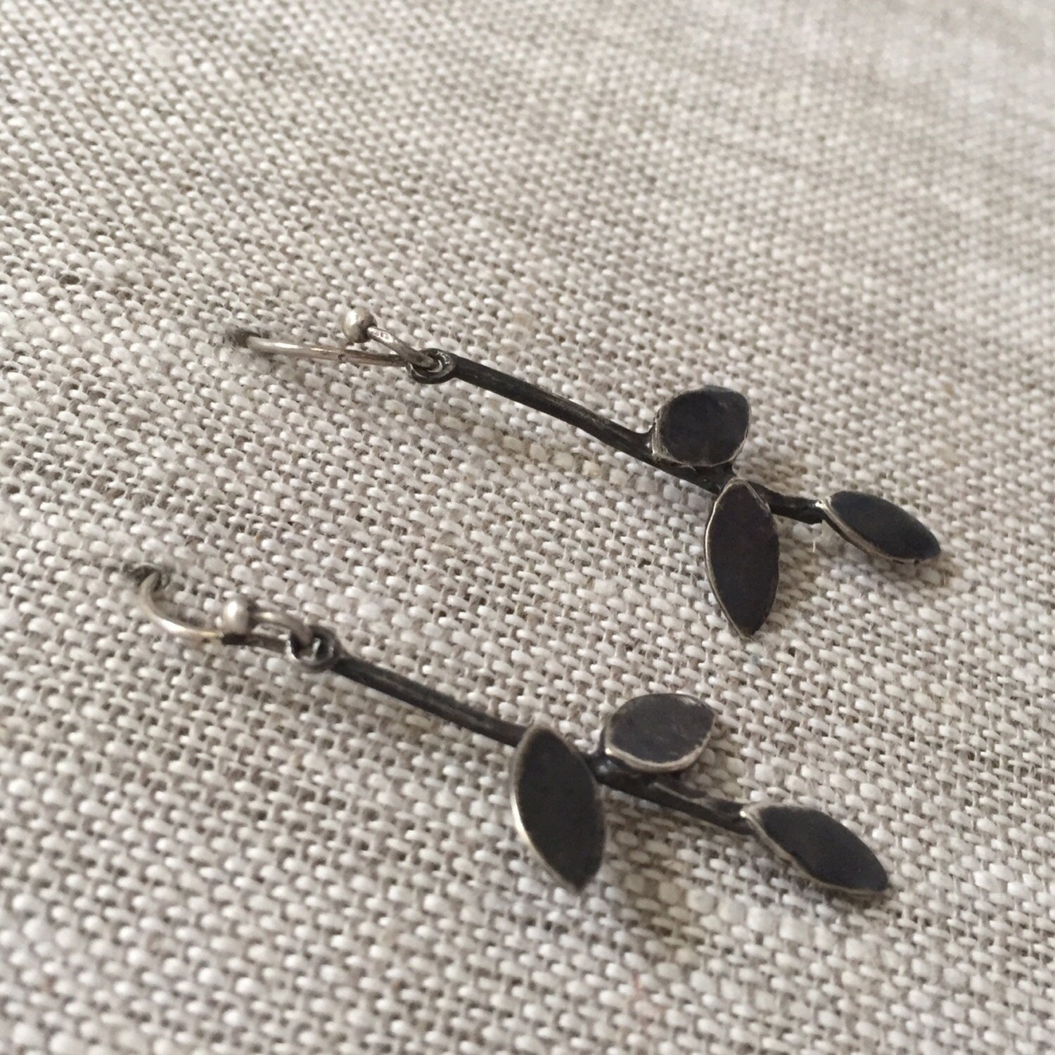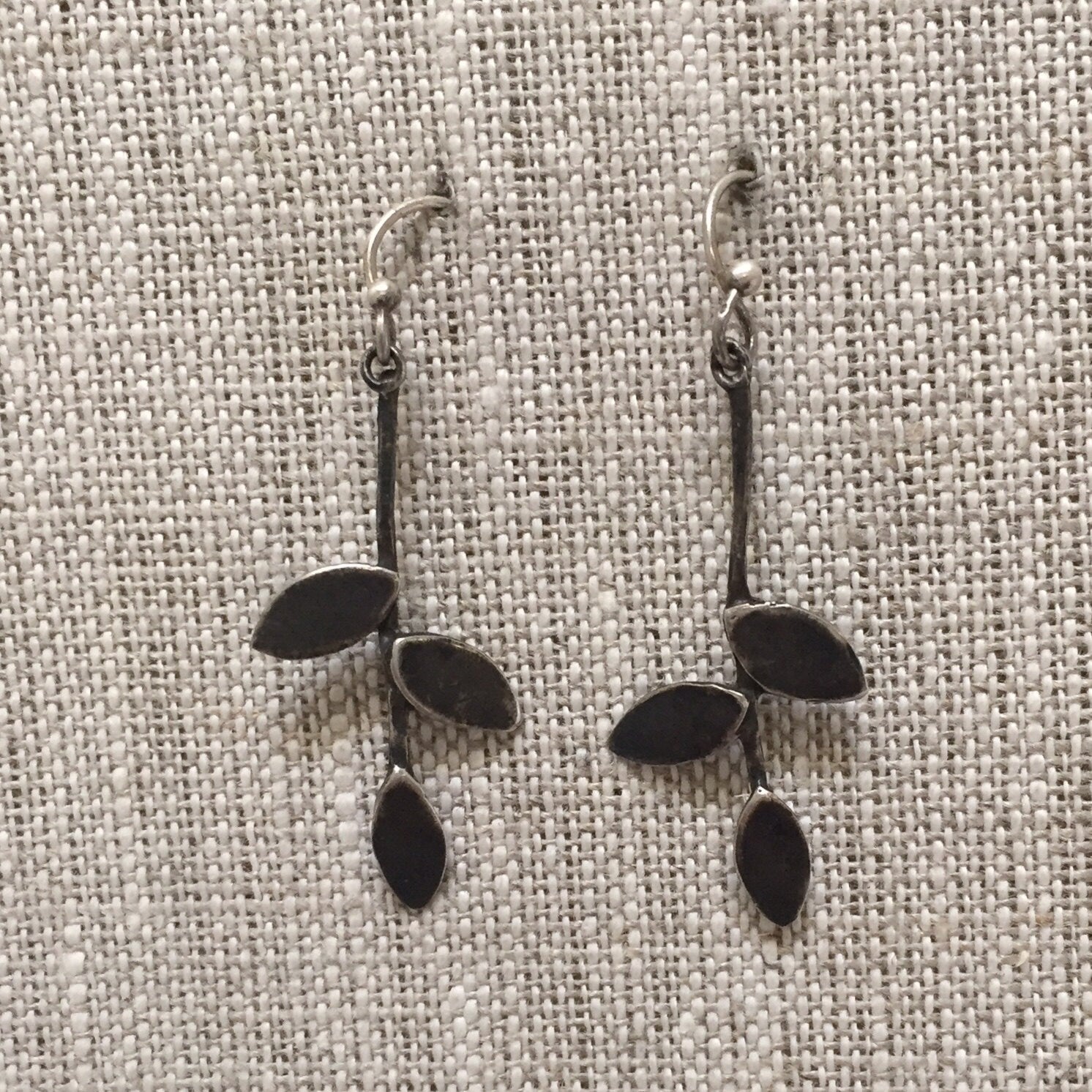 Sterling shephard hook wire hosts a solid sterling silver branch with a textured leaf design. Hand finished in a dramatic oxidized black. Dance and Celebrate natures shadows with this artistic pair of earrings.