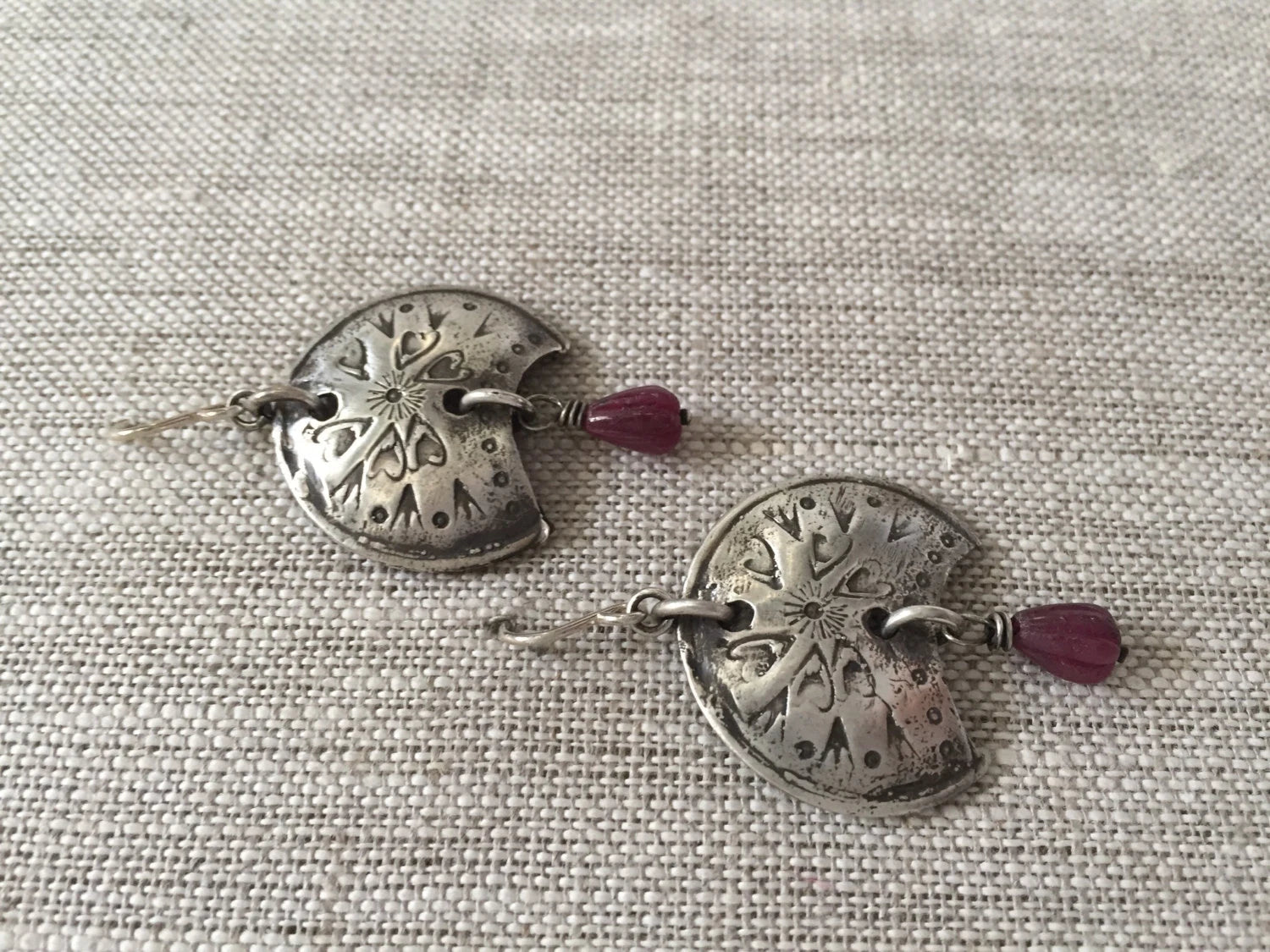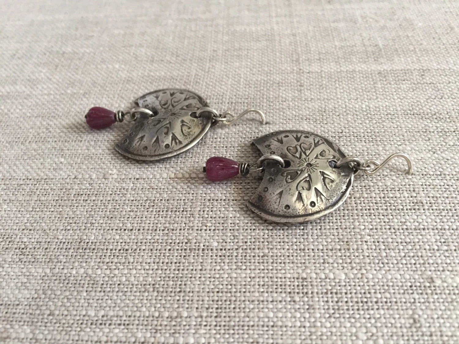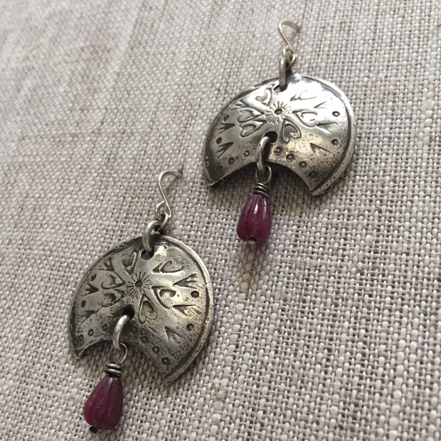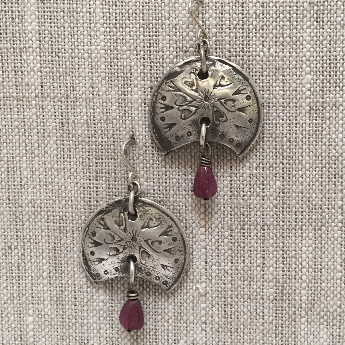 Deep pink carved ruby tear drops are the centerpiece of these shield shaped sterling silver earrings. Textured with strong symbols of courage and love. Statement earrings you'll wear and be noticed.