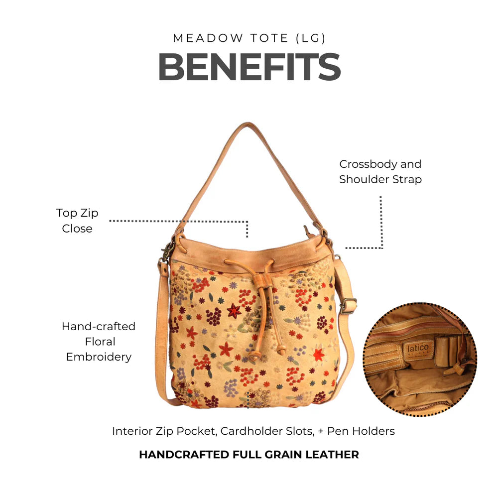 Hand embroidery and intricate leather detailing make the Meadow (Large) a standout. A top zip closure and drawstring pull-through secure your belongings, while a back zip pocket offers extra storage.