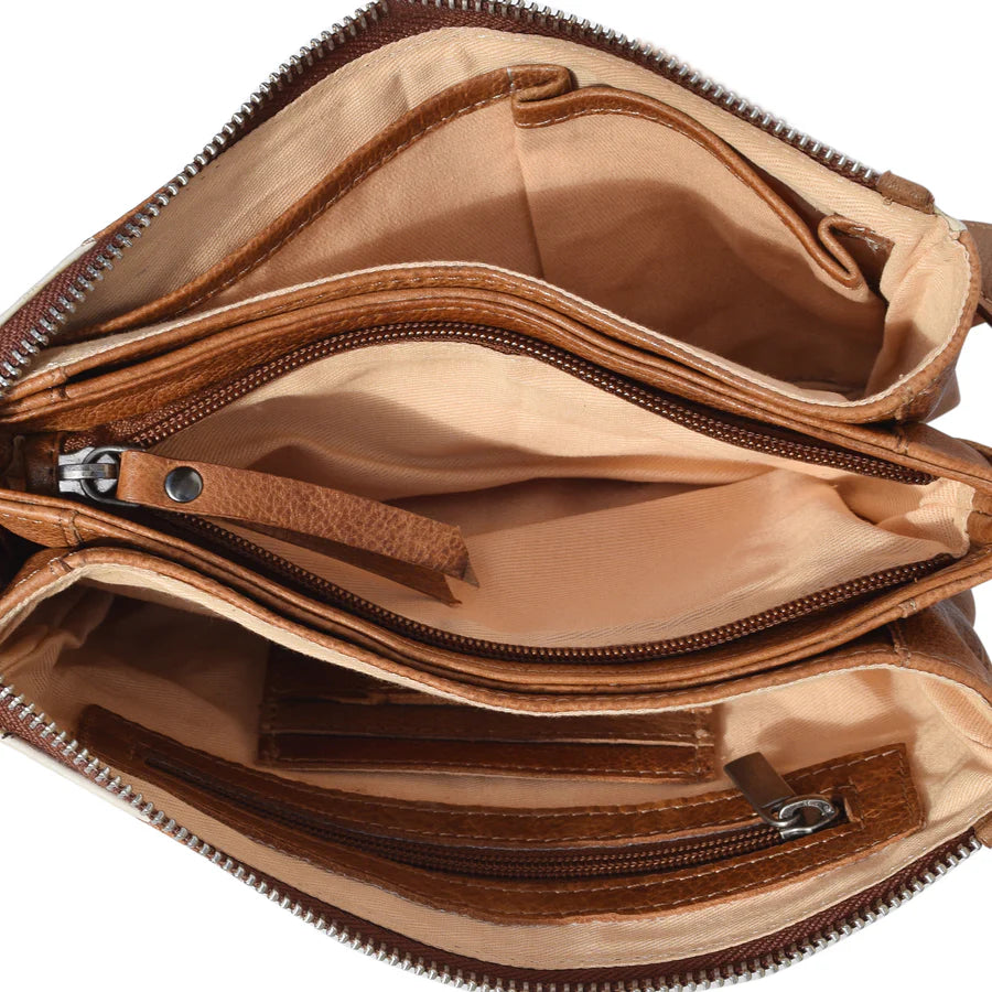 - Interior triple compartment. Front compartment features 2 open pockets, middle features zip entry to open pocket, back features zip pocket with 3 credit card slots