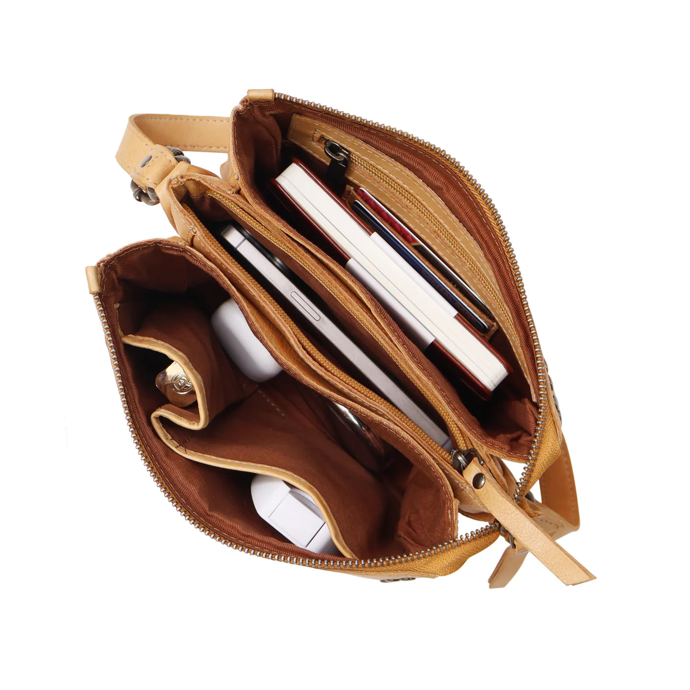 Lightweight at 0.85 lbs and 6" H x 2" D x 8.5" L with antiqued silver hardware, the Sunny Studs Crossbody is perfectly sized for essentials without the bulk.