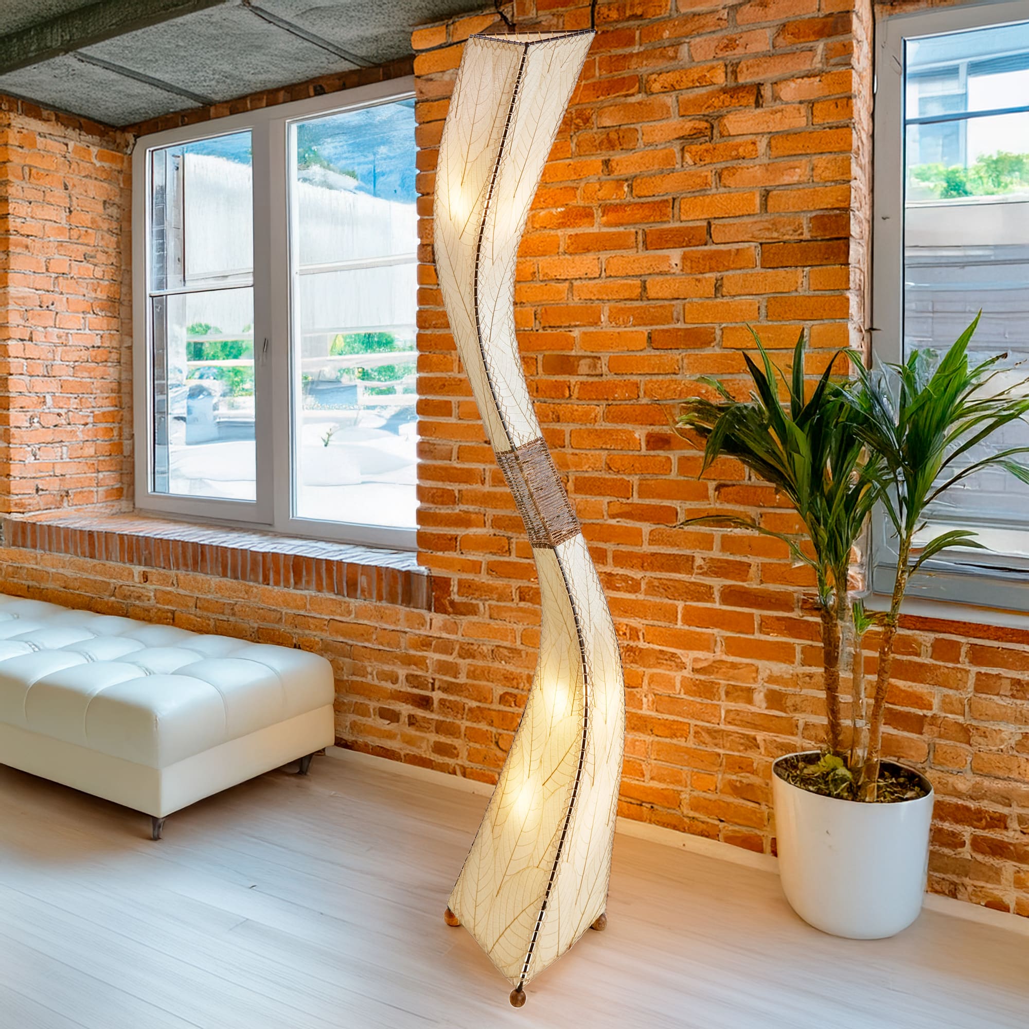 Crafted by hand, each side is composed of real cocoa leaves, pressed and preserved to reveal their delicate veins. As light passes through, the patterns shimmer softly, like sunlight on water. At the center, a band of woven abaca rope creates a sense of rhythm and grounding—a natural pause in the lamp’s upward sweep.