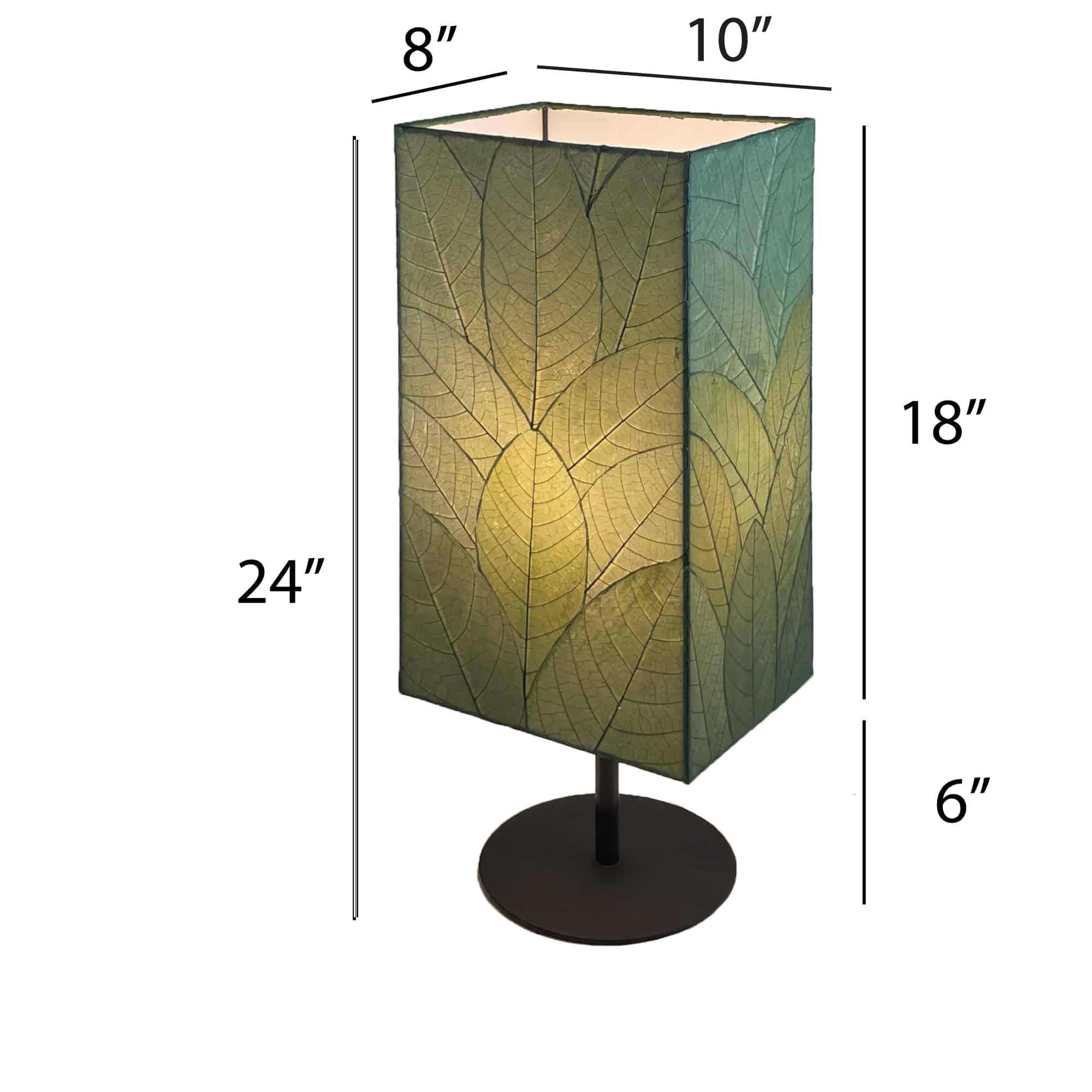 The rectangular shape gives it a clean, modern profile, while the sturdy iron base—reminiscent of a sequoia trunk—adds weight and balance. Whether in natural tones or bright jewel hues, the lamp feels both rooted and radiant. Every part of its construction—from the fair-trade leaf harvesting to the non-toxic dyes and adhesives—reflects a commitment to sustainable, ethical craft.