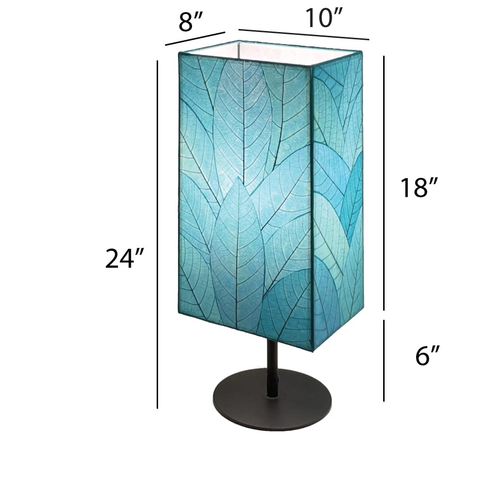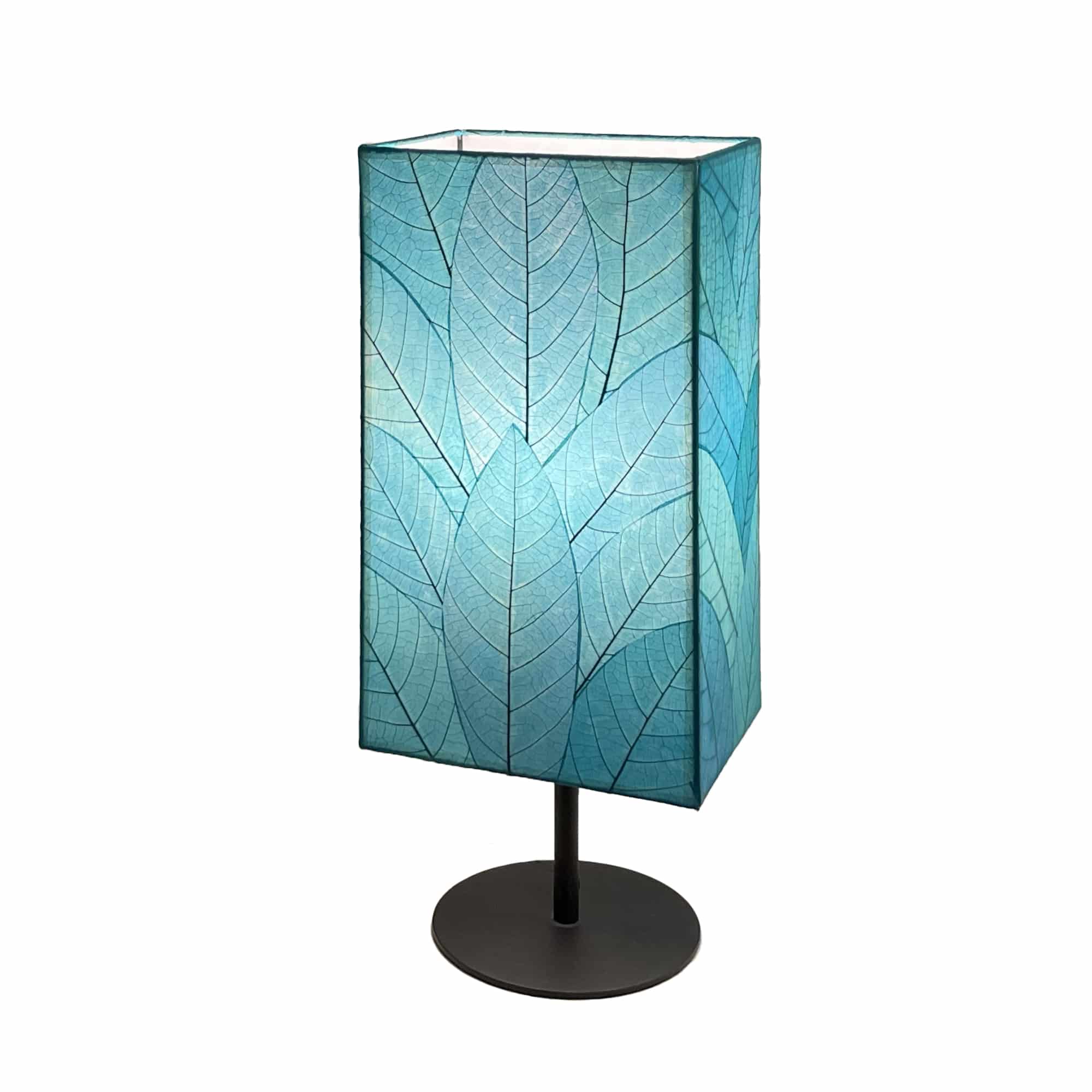 The rectangular shape gives it a clean, modern profile, while the sturdy iron base—reminiscent of a sequoia trunk—adds weight and balance. Whether in natural tones or bright jewel hues, the lamp feels both rooted and radiant. Every part of its construction—from the fair-trade leaf harvesting to the non-toxic dyes and adhesives—reflects a commitment to sustainable, ethical craft.