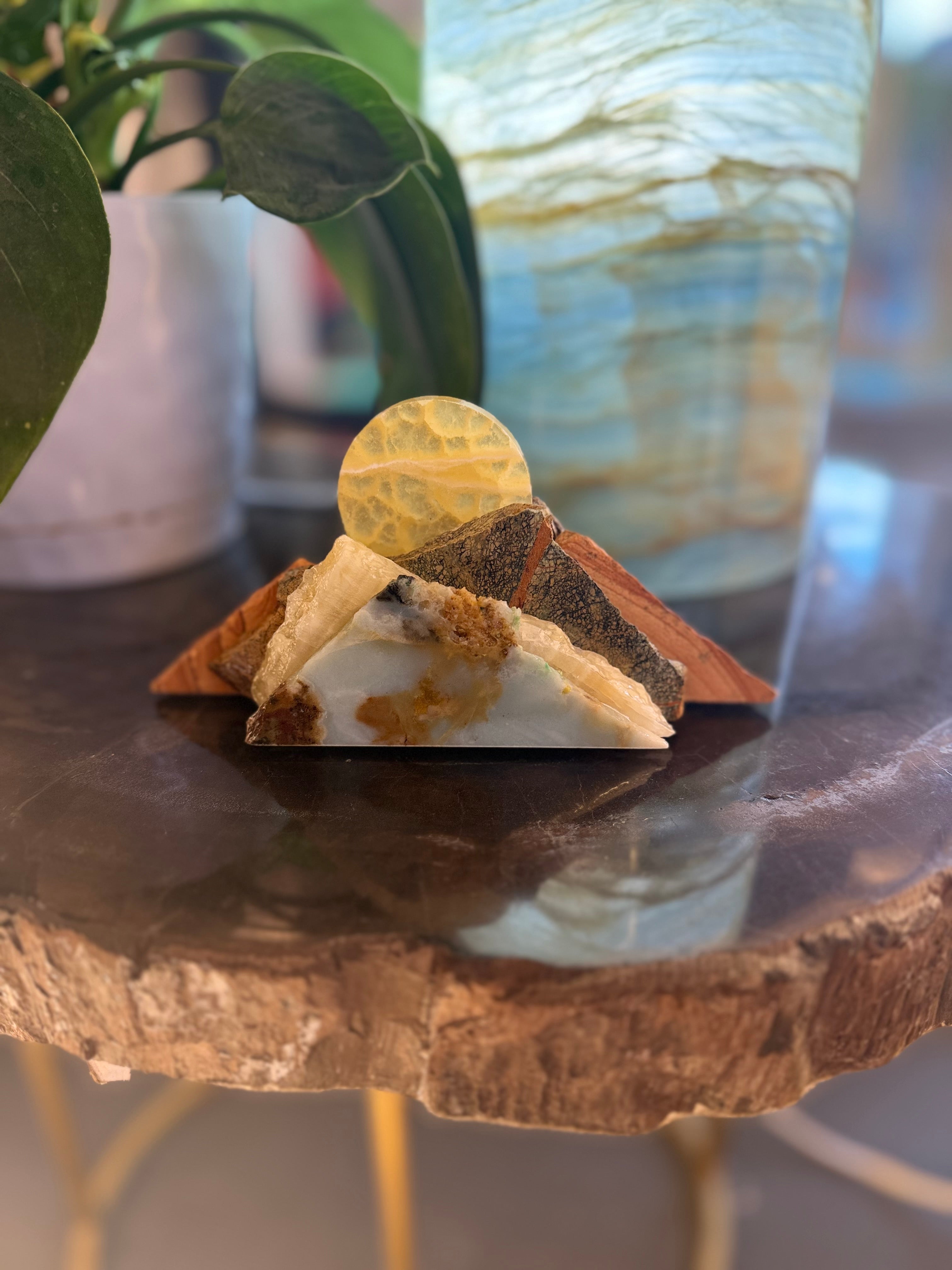 This is a 6 inch mountain scape made up of the most wonderful stones. This piece is great for a captivating center piece on any table or mantle. This is the perfect gift for a loved one or a present for yourself. The interesting thing about these is that there are different stones on each side, so your basically getting two mountain scapes for the price of one!