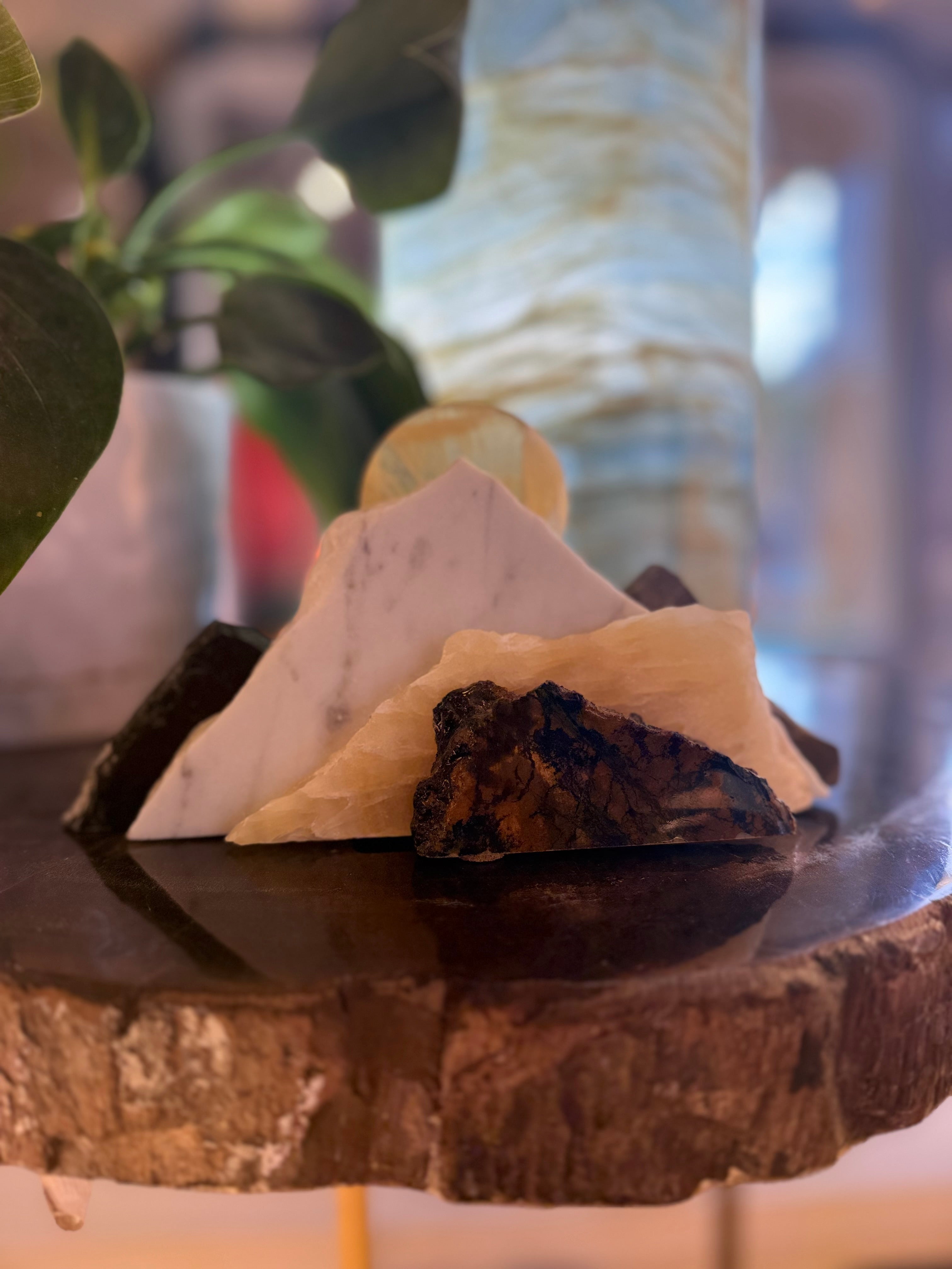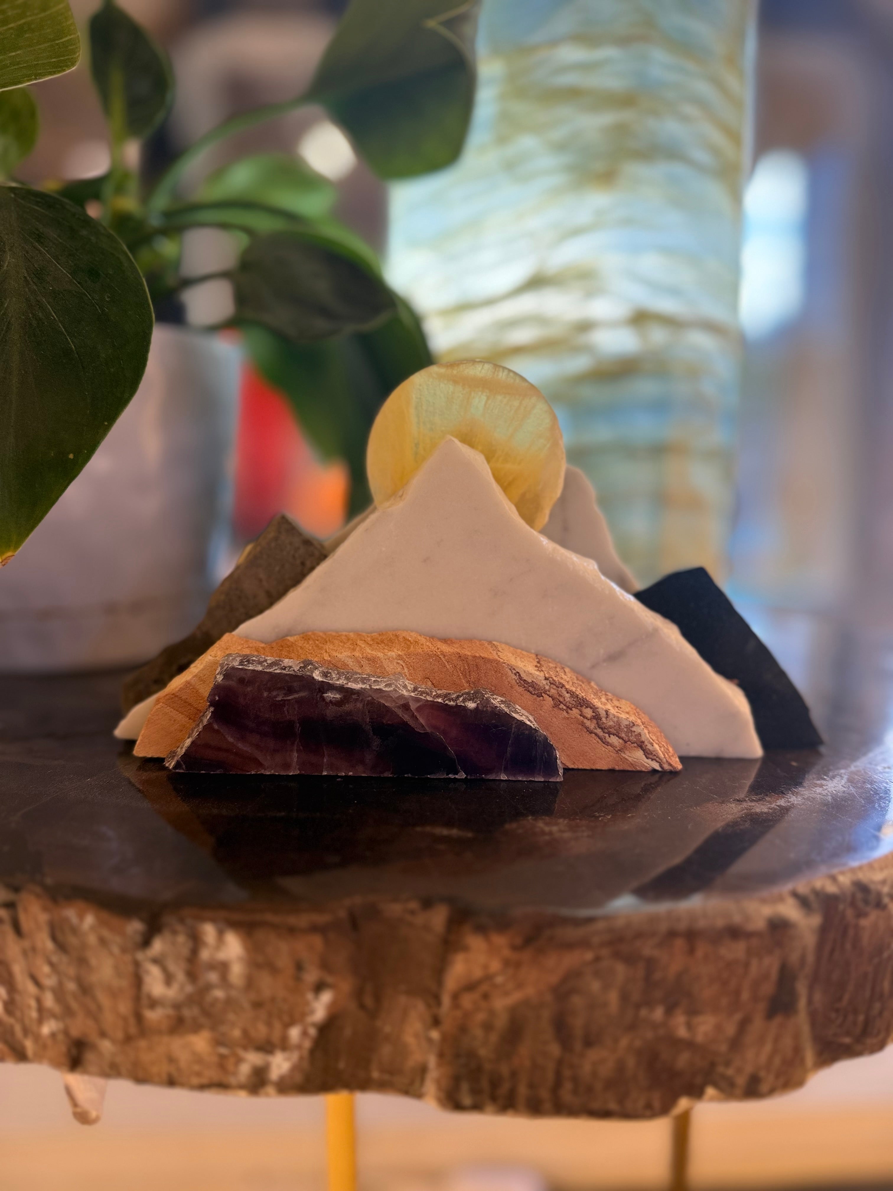 This is a 8 inch mountain scape made up of the most wonderful stones. This piece is great for a captivating center piece on any table or mantle. This is the perfect gift for a loved one or a present for yourself. The interesting thing about these is that there are different stones on each side, so your basically getting two mountain scapes for the price of one!