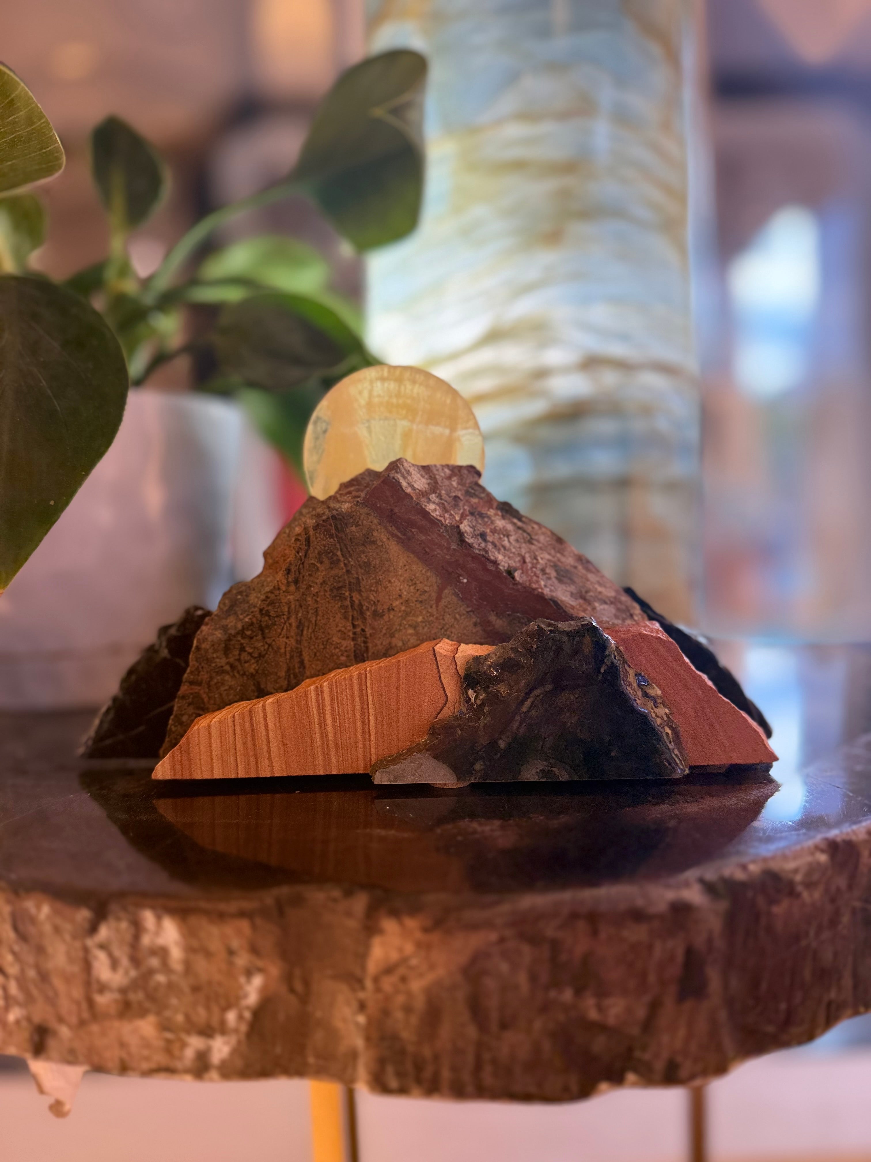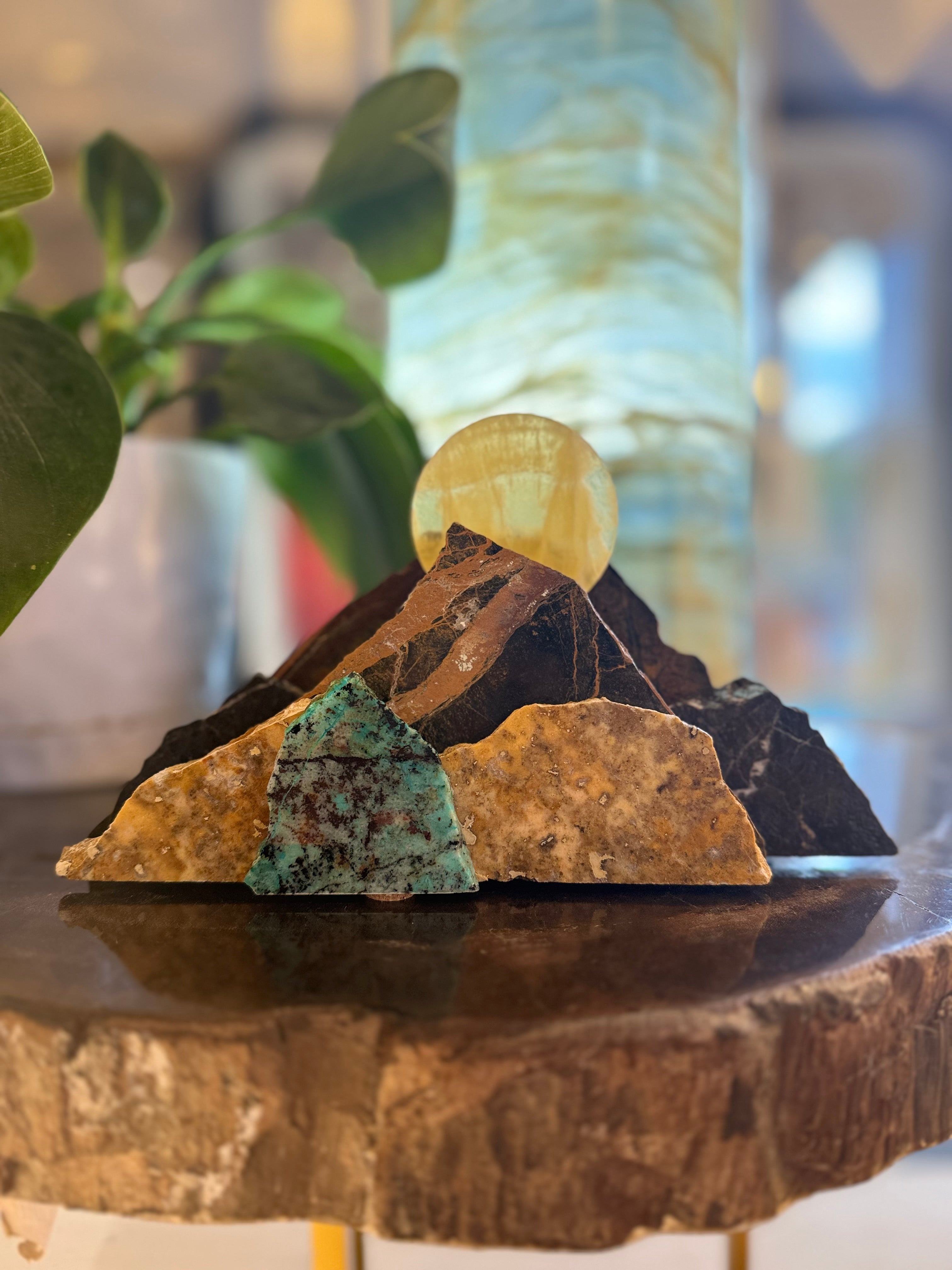 This is a 8 inch mountain scape made up of the most wonderful stones. This piece is great for a captivating center piece on any table or mantle. This is the perfect gift for a loved one or a present for yourself. The interesting thing about these is that there are different stones on each side, so your basically getting two mountain scapes for the price of one!