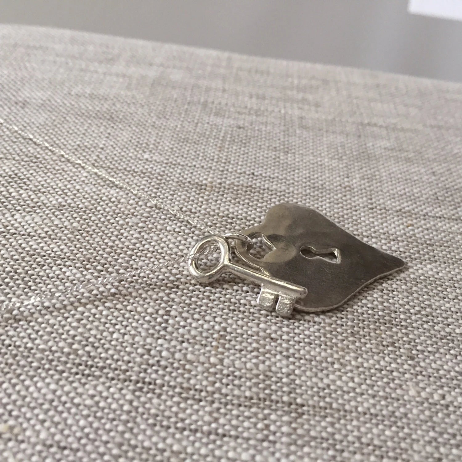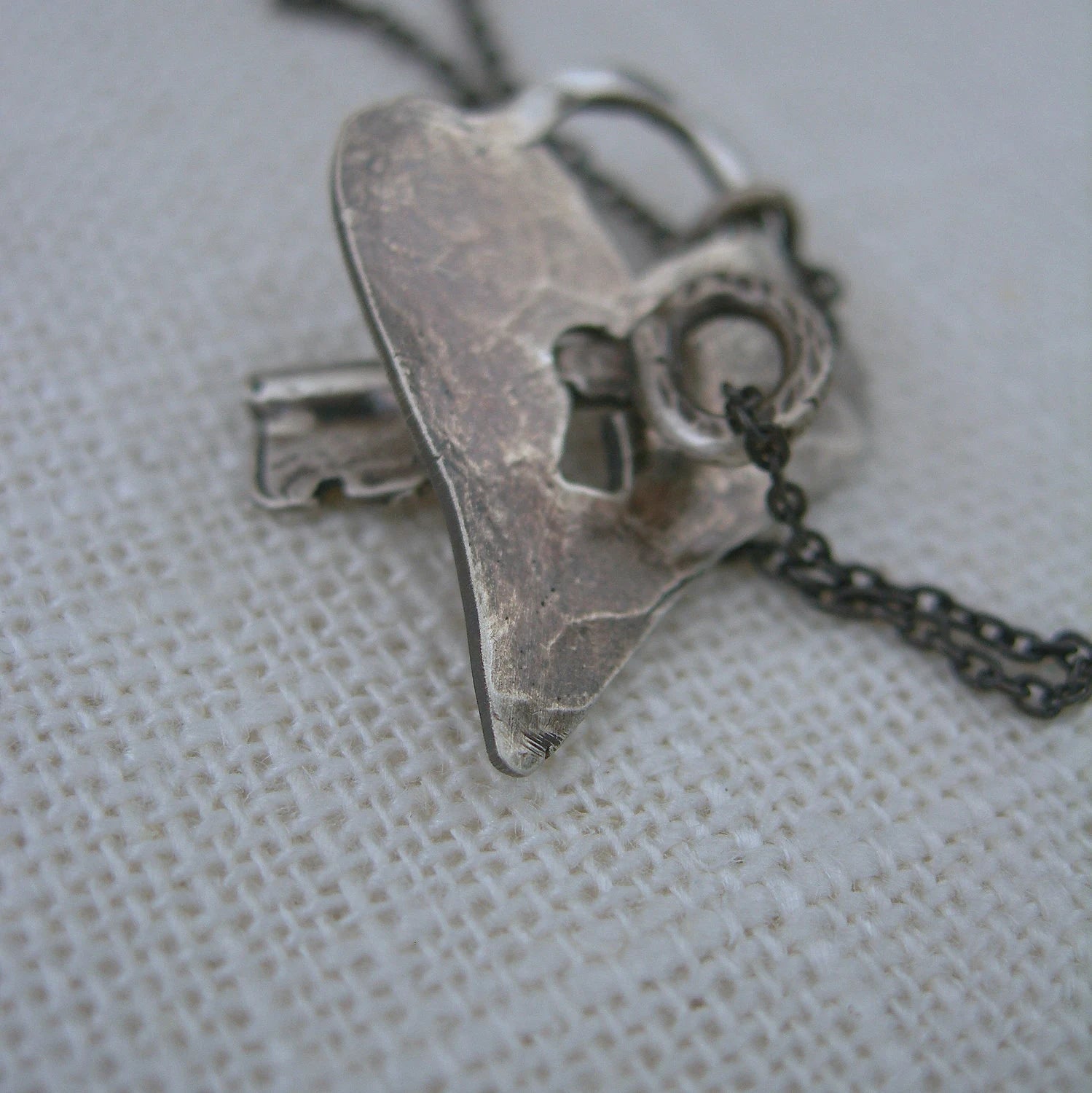 Hand hammered heart shaped lock dangles next to it's mate a tiny skeleton key.