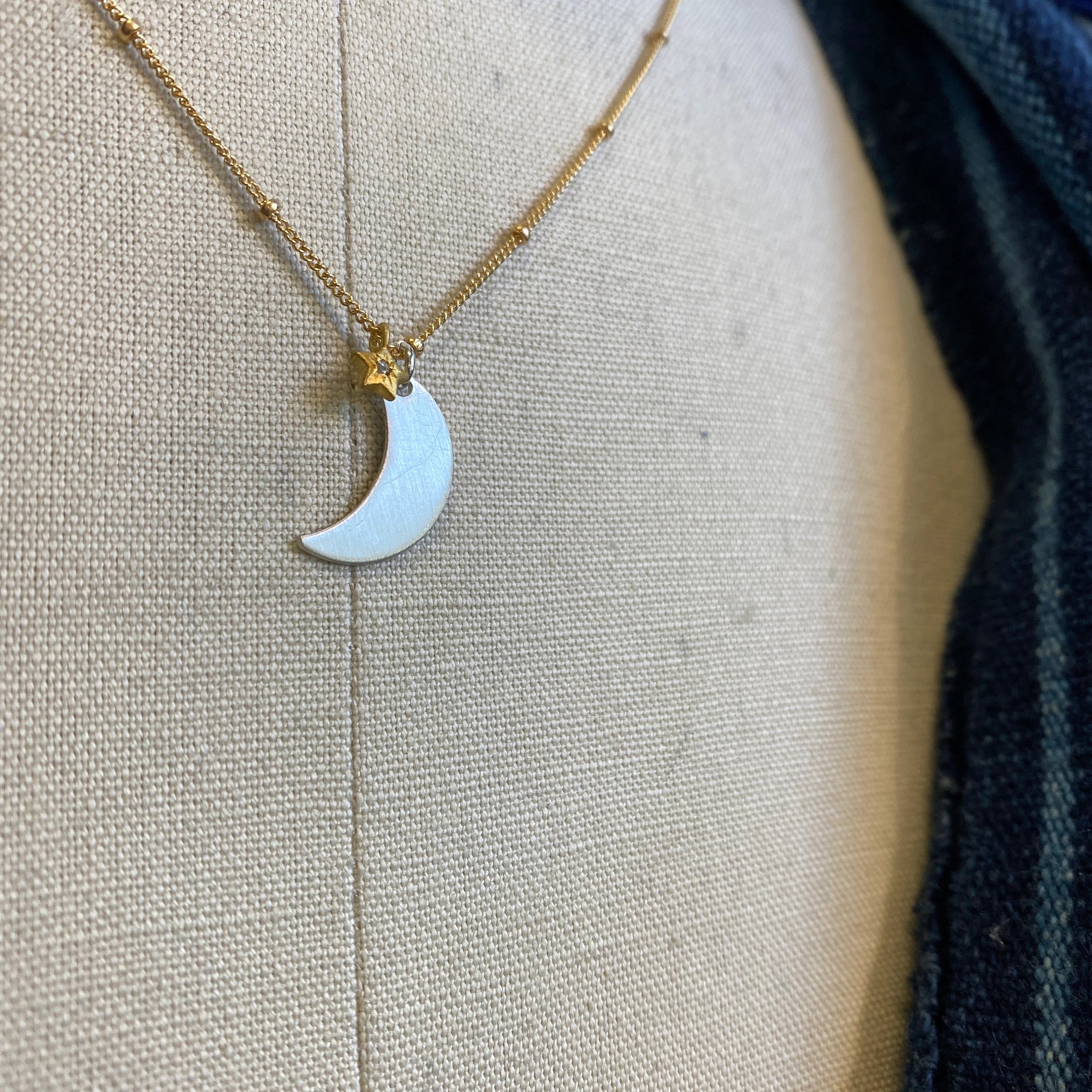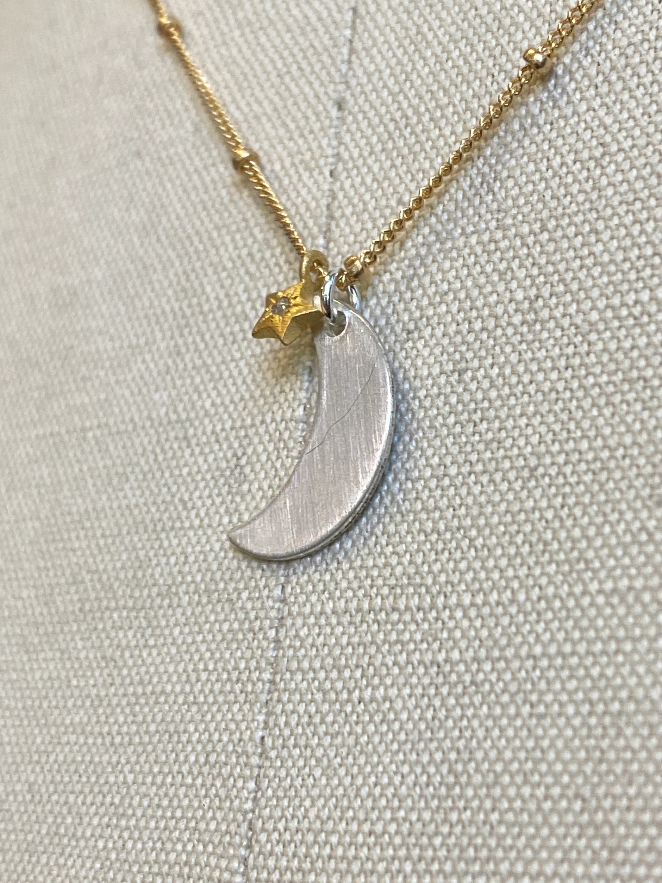 A dainty dime-sized brushed finish sterling silver moon dances beside a gold plated star with a diamond center.