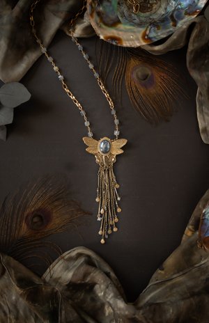 Neckline: 11” with 3” adjuster  Pendant with tassel, 5”