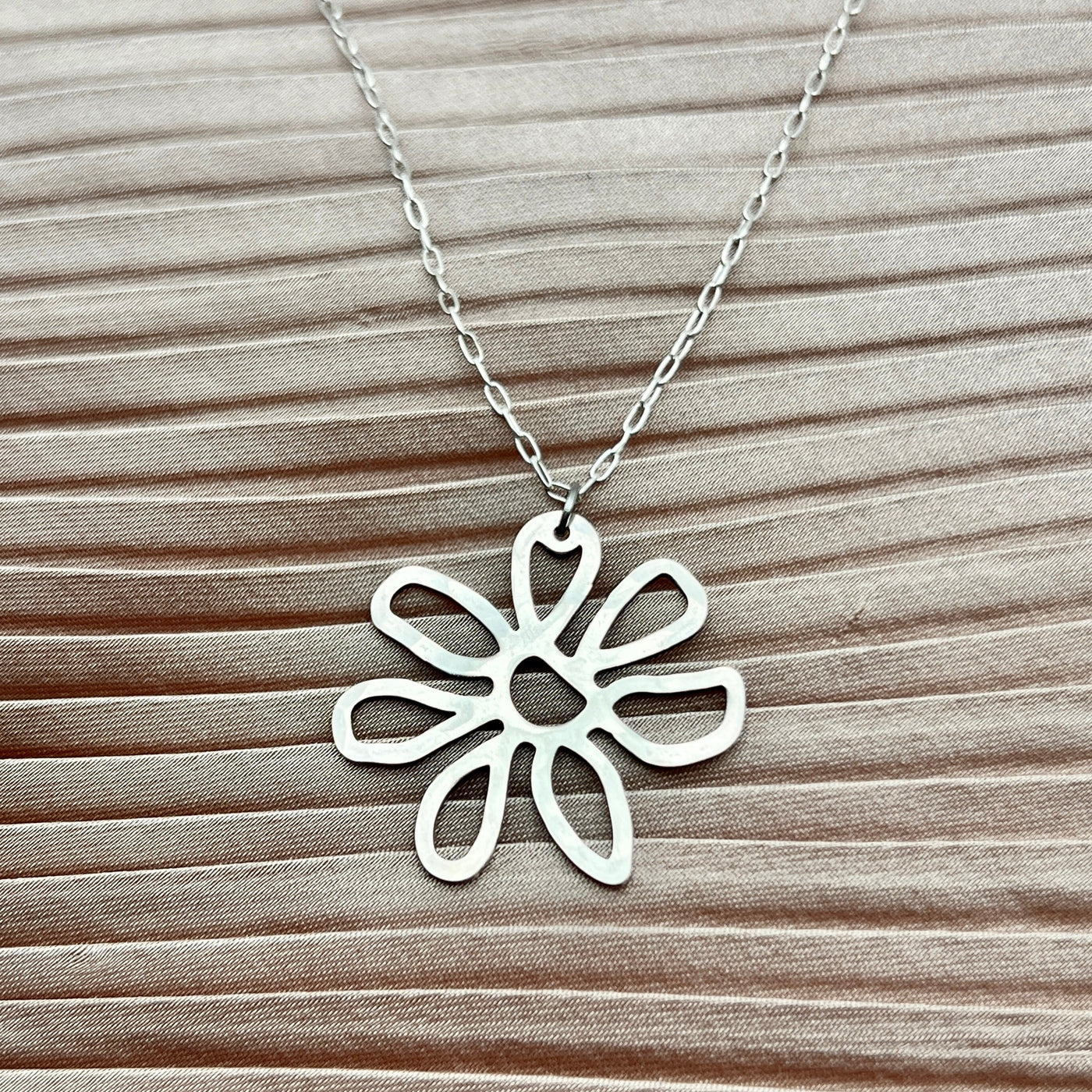 Gold or silver floral pendant that hangs from a 14k gold filled or sterling silver chain. Offered in various lengths. Matching earrings available!