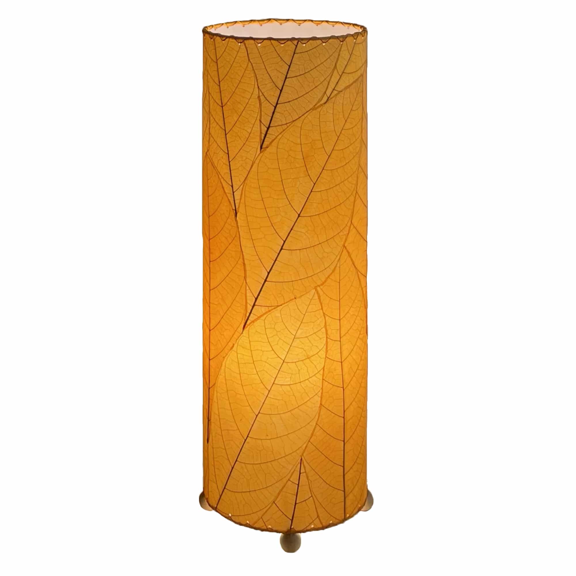 With its tall, graceful form and richly veined texture, the 24 Inch Cocoa Leaf Cylinder Table Lamp transforms natural materials into a sculptural light statement. Its vertical silhouette commands attention while still maintaining a sense of calm and softness. Real cocoa leaves—gathered from the same trees that bear chocolate’s iconic bean—are pressed and preserved into glowing, translucent panels, highlighting every vein and curve.
