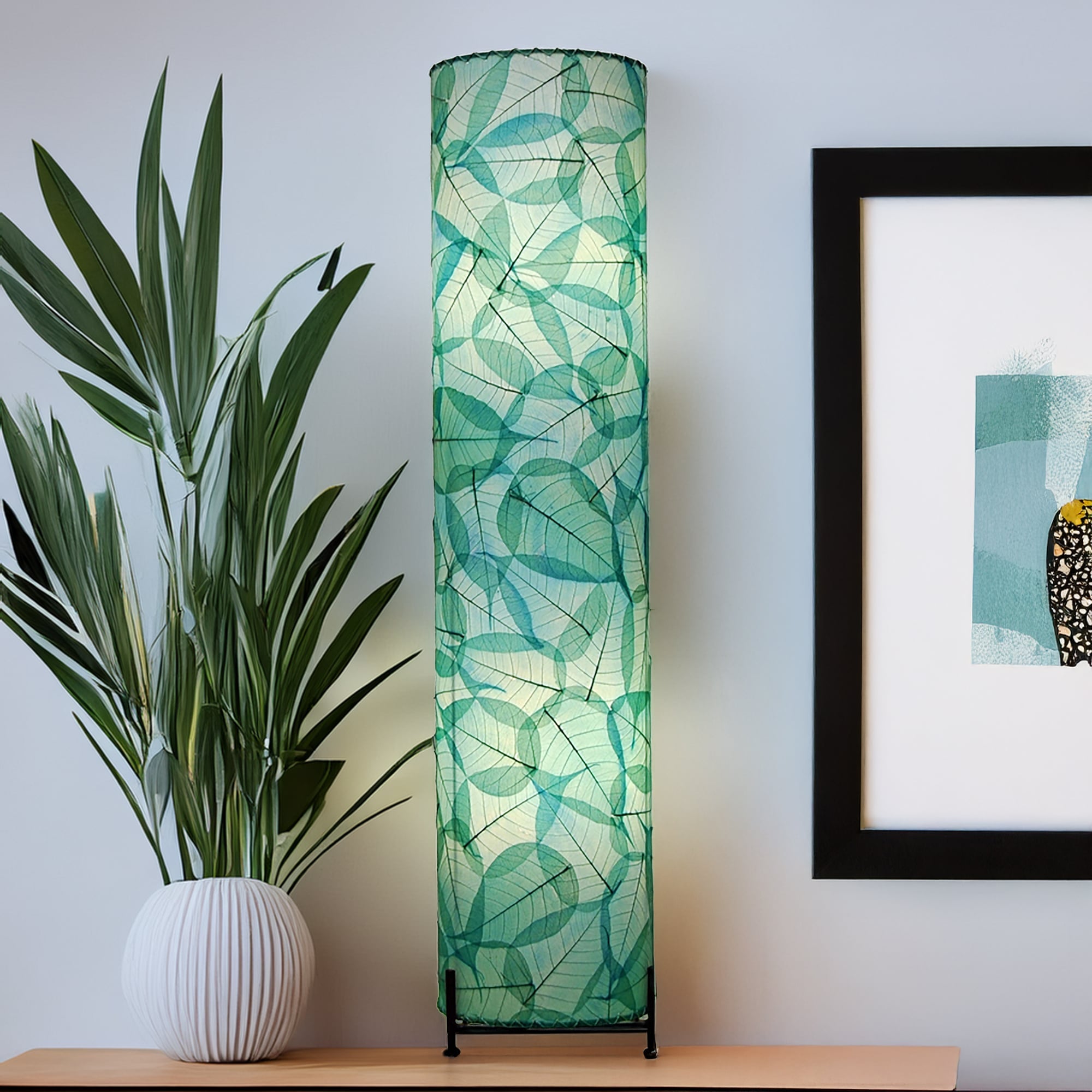 Each panel is handcrafted from real cocoa leaves, pressed and preserved to reveal their intricate veins. They’re stretched across a sinuous wrought iron frame and stitched with abaca twine for an earthy, textured finish. The lamp feels balanced—sculptural without being heavy, bold without being loud.